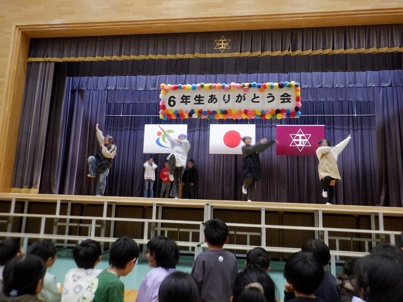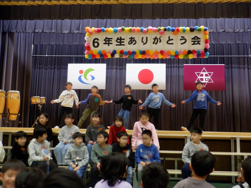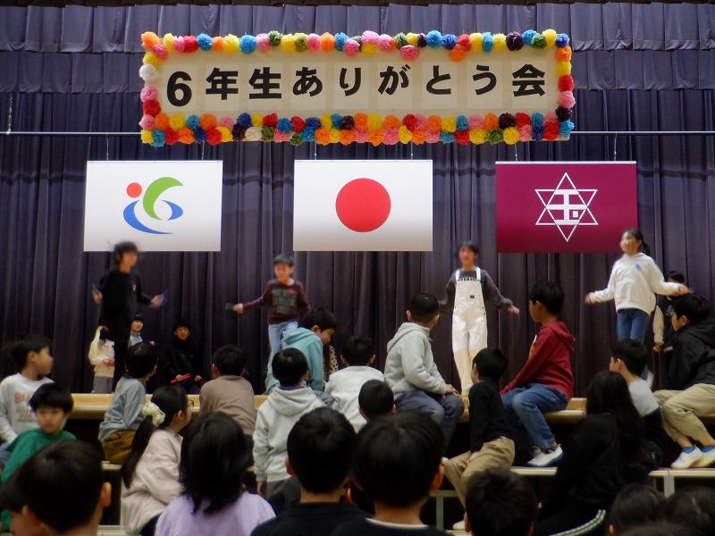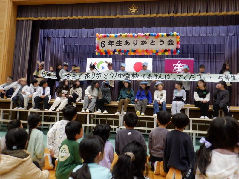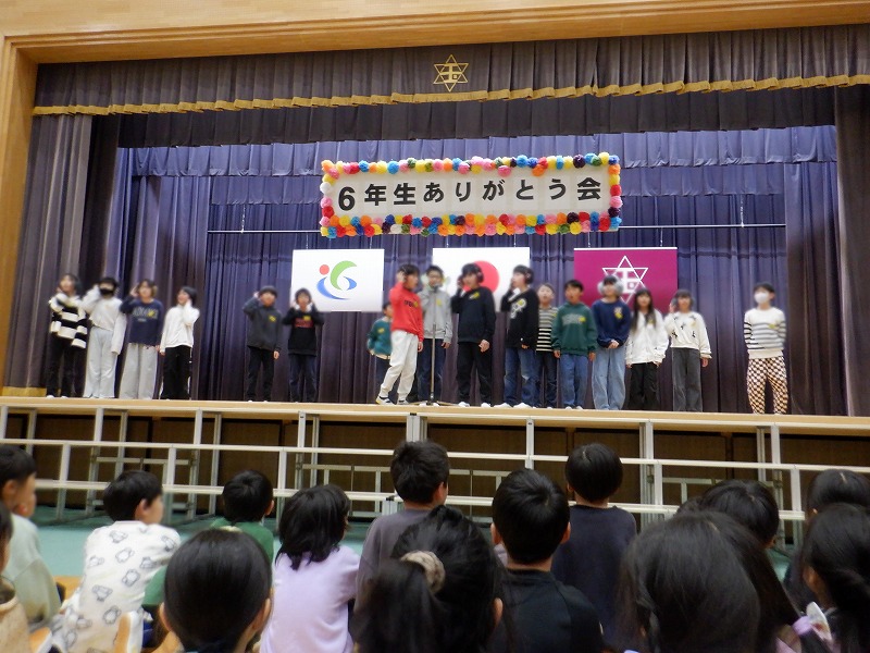 「6年生に感謝の気持ちを伝えて思い出に残る会にしよう」を合言葉に、5年生が中心となって企画・運営しました。各学年が、趣向を凝らした出し物で感謝の気持ちを伝えました。お世話になった6年生の笑顔が見たい一心で準備や練習に取り組み、本番では心を込めて6年生との思い出を劇で表現したり踊ったりしていました。6年生の顔も自然とほころんで、会場は終始温かな拍手に包まれました。