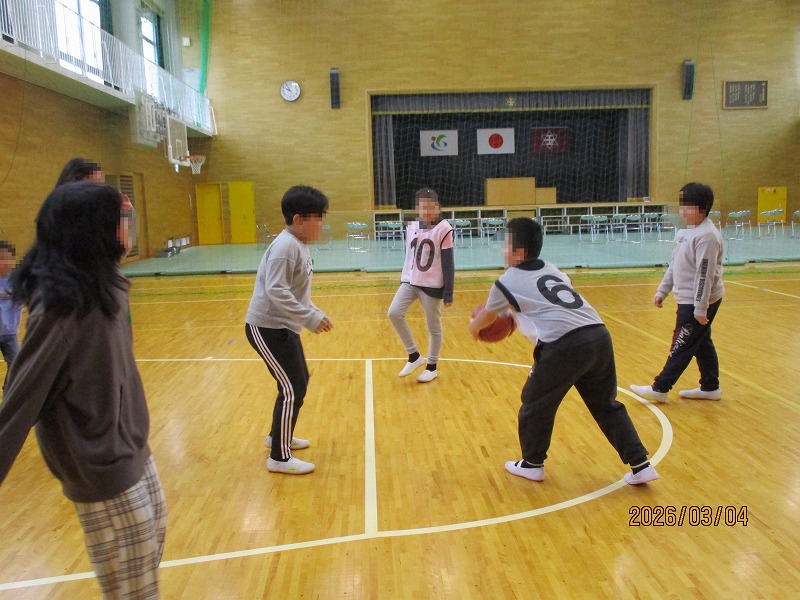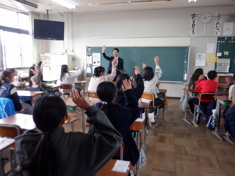 6年生が進学する玉園中学校の英語教諭とALTが、6年生に外国語の授業をしてくださいました。最初は表情の硬かった子どもたちも次第に前のめりになり、積極的に交流していました。中学校の英語の授業の見通しがもてたのではないかと思います。