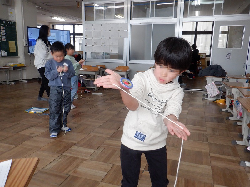 生活科の時間に、昔あそびに挑戦しました。学習ボランティアとして、おうちの方も来てくださいました。運動場に雪が積もっていたため凧あげはできませんでしたが、室内で、こま、けん玉、めんこ、お手玉、かるた、すごろくのコーナーに分かれて、それぞれ自分がしたい遊びに体験しました。