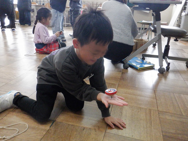 こま回しコーナーでは、「保育園でやっていた」と言う得意な子が技を見せると、周りの子どもはうらやましくて仕方がないようで、上手な子を一生懸命観察し、見よう見まねで挑戦していました。けれども、すぐにできるはずはなく、何度もやるうちに少し回るようになると、満面の笑みがこぼれました。子どもたちの多くが普段親しんでいるゲームやSNSにはない「楽しさ」を感じられたのではないかと思います。