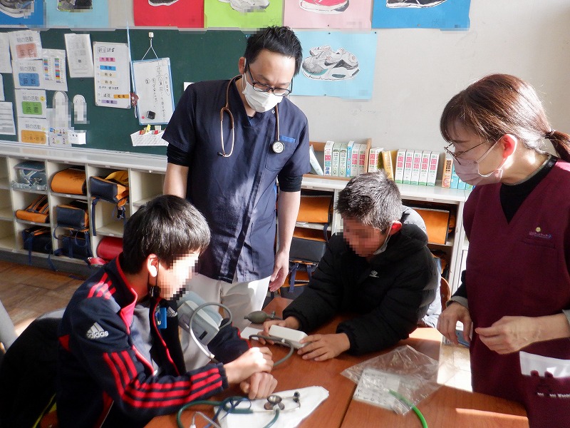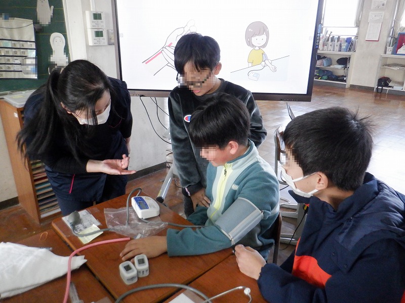 県看護協会や近隣病院から5名の方がお越しくださり、前半は看護師を目指したきっかけや仕事の魅力についてのお話、後半は聴診器や血圧計などを使った体験と、盛りだくさんな内容でした。「た・ま・お」の学校目標は看護師の適正と合致していると聞き、子どもの目が輝きました。
