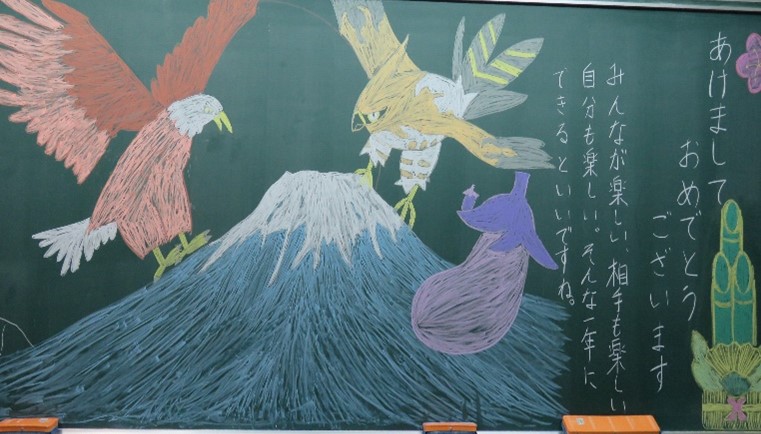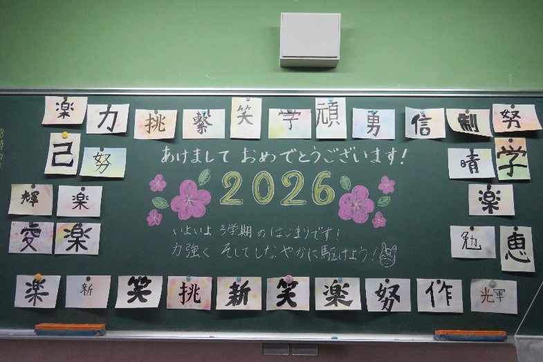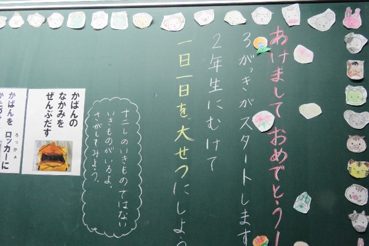 と思います。先生たちも同じなんですね。子どもたちが学校に来てくれるのを楽しみにしてくださっていました。教室の黒板には、新年の始まりにふさわしいイラストと「次につながる3学期!みんながんばろう!」という言葉が印象的です。先生たちの思いが初日の教室にあふれていて、あたたかい気持ちになったのでいくつかを紹介します。