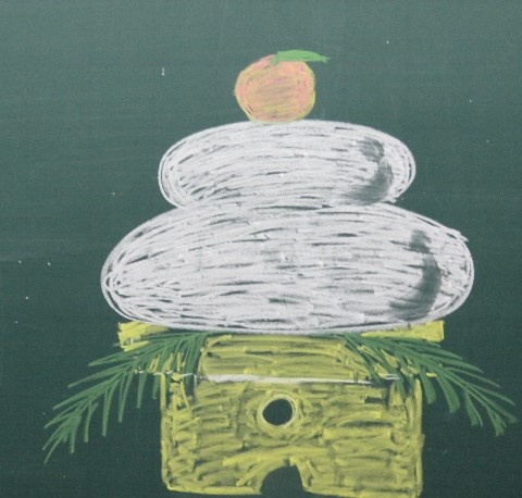 注連縄づくりを指導してくださったのは、地域コーディネーターの奥さん率いる米づくりの達人の皆さんです。注連縄を作るためには、藁を「縒る(よる)」必要があるそうですが、これがとても器用さを必要とする技でした。達人たちのように、きれいでしっかりした注連縄はなかなかできませんが、子どもたちは達人に教えてもらった通りに「前に前に縒って・・・下から渡す。」と合言葉のように言いながら、3人組になって一生懸命に作りました。できあがった注連縄にとても満足そうな表情を浮かべていたのが印象的です。