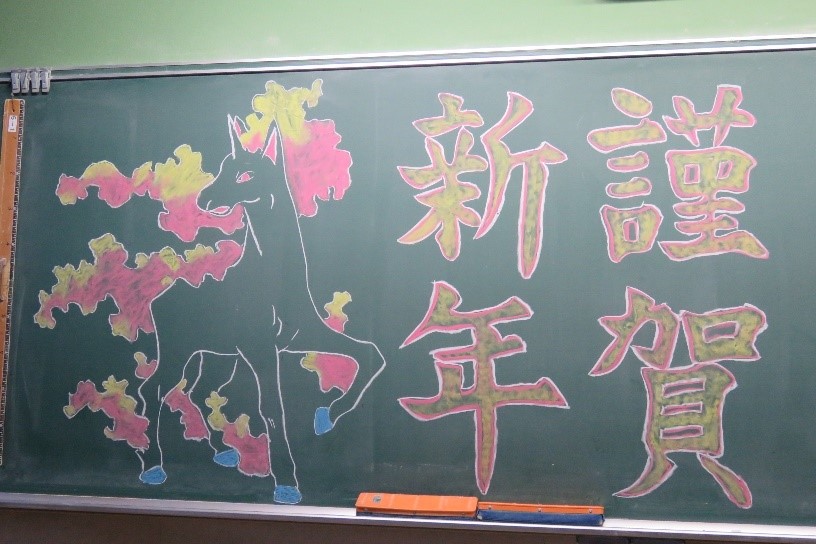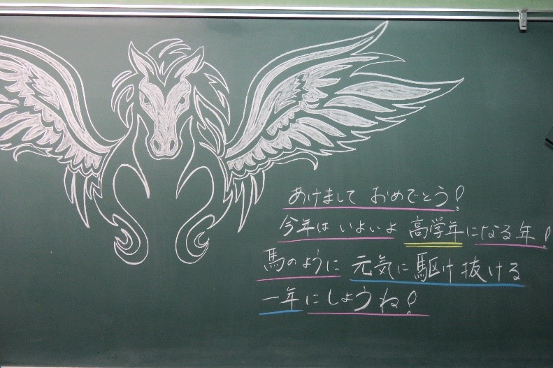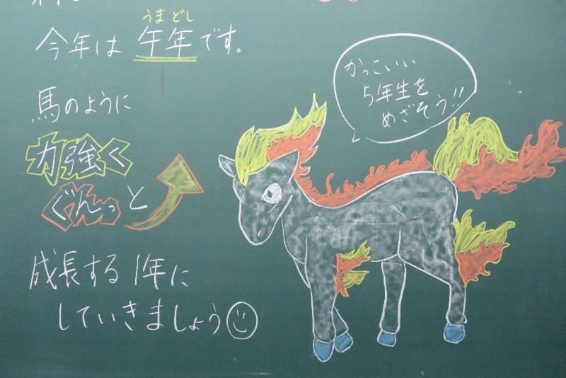 午年は、十二支の7番目にあたり、前進や飛躍、情熱、発展を象徴する縁起の良い年とされています。また、「午」の字は、時間の区切りや方角にも関連しています。午年は、太陽が最も高く昇る「正午」の時間帯を表すことから、陽気で力強いイメージを持ちます。古くから馬は人や物を遠くへ運ぶ存在であり、「願いを乗せて未来へ駆ける」という意味も込められています。みなさんが1、2学期にがんばってきたことをうんと伸ばせる3学期となるようにと思います。