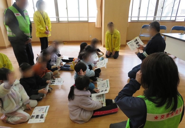 と言ってくれました。体育館では、警察や市の方から、交通安全で気を付けるポイントを振り返りながら、交通安全の冊子にシールを貼って、みんなはうれしそうです。