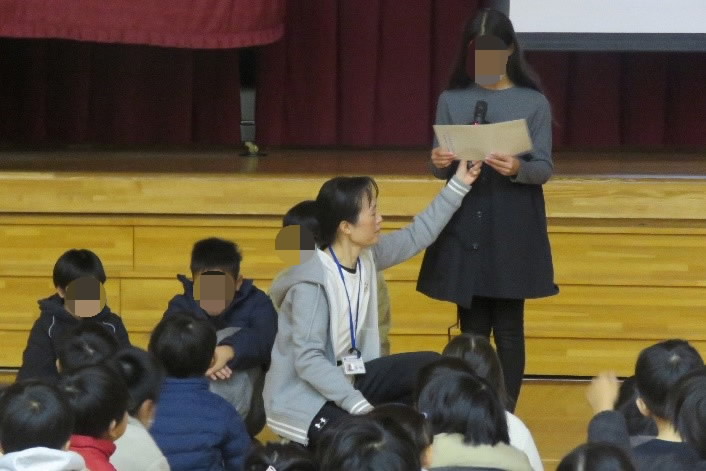各学年の代表者(今回は1組の出席番号1番の者)一人ずつに壇上で「修了証」を授与します。トップバッターは、1年生ANさん。きれいな姿勢にきれいなお辞儀、私(校長)の目をずっと、まっすぐに見ながら「修了証」を受け取ります。一人目から、こんなに完璧で、見事な「受け取り方」をしてくれるので、また胸の奥の方からぐっとくるものがこみあげてきて、私の涙腺を攻めてきます…。そんな気持ちをぐっとこらえながらなんとか5人の修了証授与を終え、いよいよ「校長講話」です。