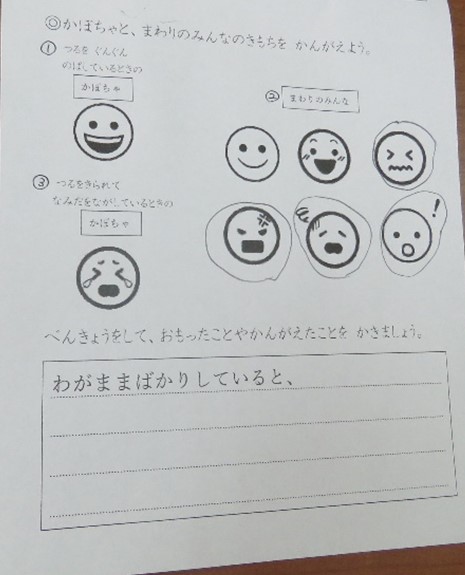 道徳の授業のはじめに、F先生から「わがままって、どんなことか分かる?」と聞いてくださると、「ぼくがおばあちゃんとお風呂に入って背中を洗っていたら、おばあちゃんが『もっと洗ってほしいなあ』って言うねん。手がだるくなるから困るよ。大変やで。」「私の妹が私のおもちゃをとって遊ぶから、いやなの。困るの。」とかわいい答えが返ってきて、聞いていた私たち大人は、かわいい発表に家庭での様子も想像されて、あたたかい気持ちにもなりましたし、ほほえましくも感じてしまいました。他の子どもたちのつぶやきも聞いていると、「わがまま」という言葉については、わかってくれていたので、「かぼちゃのつる」のお話をもとに「わがまま」について考えていきます。