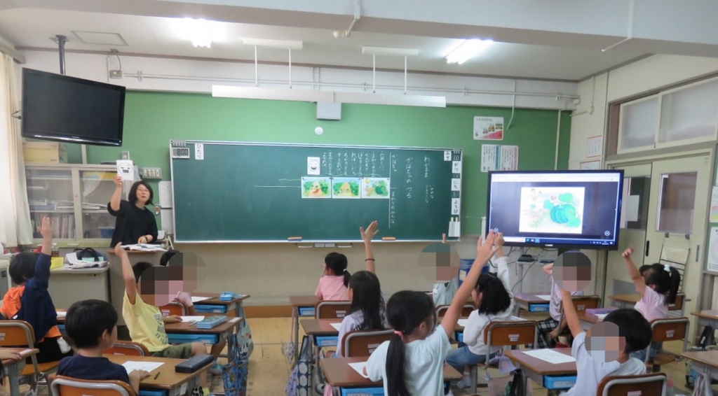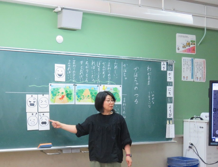 F先生の授業は、いつも子どもから上手に考えを引き出してくださいます。この日も、かぼちゃ、はち、ちょう、すいか等の気持ちを考える時には、いろいろな表情のイラストを用意してくださっていました。まだまだ1年生は、気持ちを表現することが難しい時期です。でも、表情イラストがあると、その表情から気持ちを想像することができ、考えはどんどん出てきました。