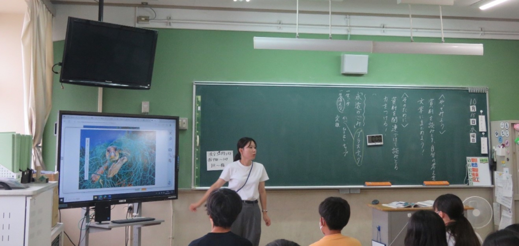 私は、授業の始まりは本読みかなあと思っていたら、T先生は、1枚の写真を見せてくださいました。ウミガメが釣り糸にからまっている写真です。その写真を見せながら、子どもたちに「環境について感じていることはないですか。」と聞かれました。子どもたちからは、「かわいそう、釣り糸は溶けて消えないから一生ごみのままや。」「プラスチックは身の回りにいろいろと使われている、かごや引き出し、鉛筆のキャップ、定規もプラスチックでできている。」など、この題材に迫る意見も出てきたところでようやく本文を読まれました。T先生のこの問いかけがあったことで、プラスチックごみについて意識をもち学習に入ることができました。