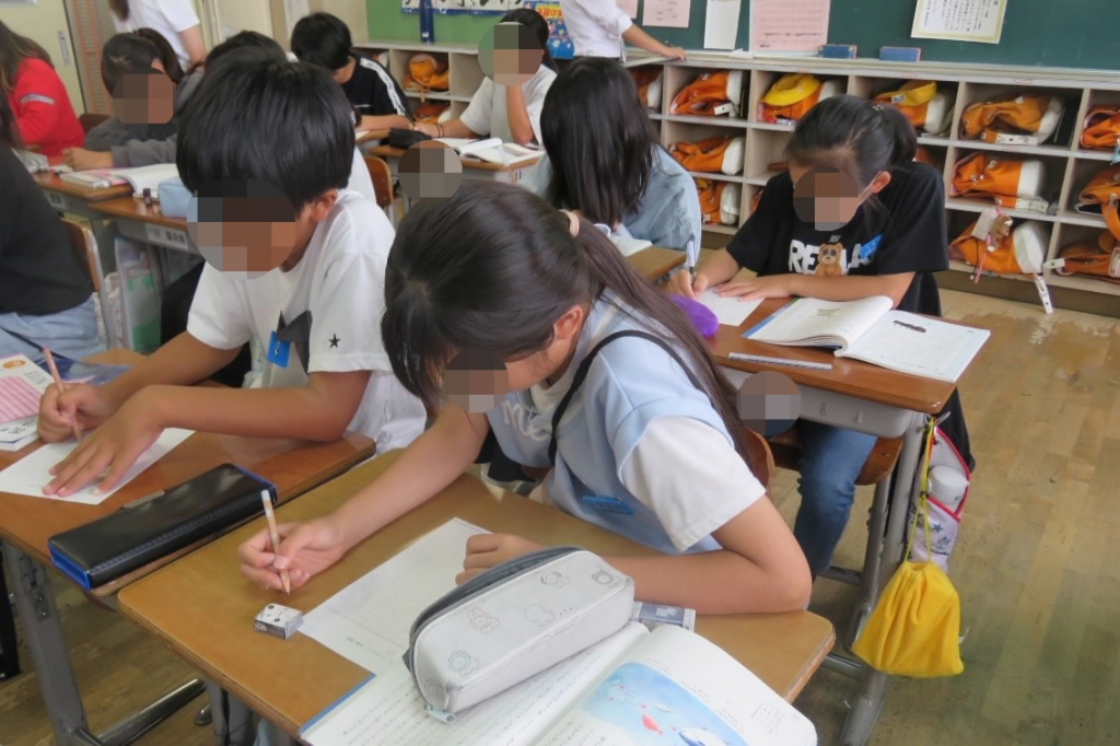 T先生は、いつも子どもの様子をみながら丁寧な指導をされます。この日の範読もびっくりしました。T先生は子どもたちの机の間をゆっくりと歩きながら、教科書を読まれています。読みながら、どこを読んでいるのかわからない子どもに教科書の行を示されたり、姿勢を正されたり、机上を整えられたりとされていて、目がいくつあるのかと驚いてしまいました。しかも、ゆっくりとわかりやすく読まれているので子どもたちの集中力も感じます。この題材には、多くの資料がでてきますが、集中して聞いていたこともあったので、初めて読んで感じたこともたくさん出てきて、短い時間にも関わらずしっかりとワークシートに書けていたことに感心しました。また、このように集中して書くことができるのは、今までの学習の積み重ねをもじました。