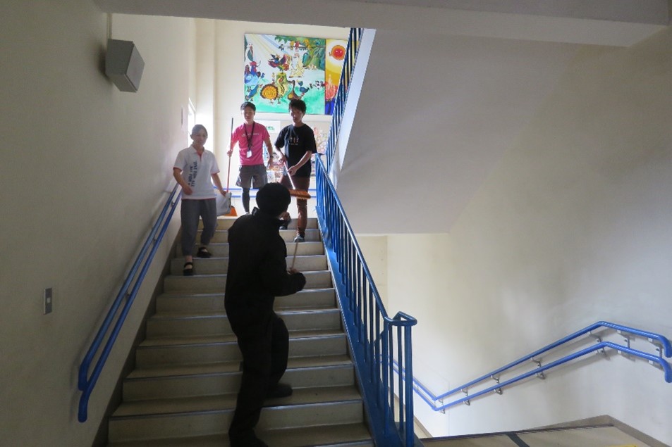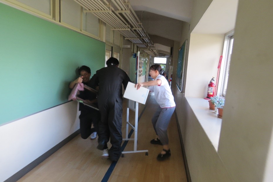 犯人役の先生も止める先生も真剣です。今回は、玄関前で対応した教員は手元に刺股がない想定で、身の回りにあるもの(掲示板)で校舎内に侵入できないように必死に止めてくださいました。各階には、刺股を持った先生方がこれ以上、侵入できないように構え、犯人役の先生を止めてくださいました。教室の子どもたちは、廊下側の入り口の鍵をかけ、入れないように机や椅子でバリケードを作り、教室の1か所に集まり静かに隠れます。先生方はほうきなどを持ち、待機してくださっていました。