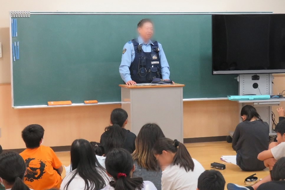 子どもたちのもっていた警察の仕事は、TV等でみる「犯人をつかまえて逮捕する」「事件の捜査をする」印象があったようですが、私たちと警察をむすぶ「音の架け橋」である「警察音楽隊」という仕事や災害地域で安全警備の仕事をされていることも知り、警察官という仕事について考える機会になりました。お話の中で、自分の頑張りで町の安全を守ることができることが何よりのやりがいだと言われていた言葉が印象的でした。