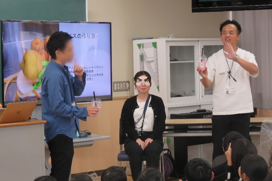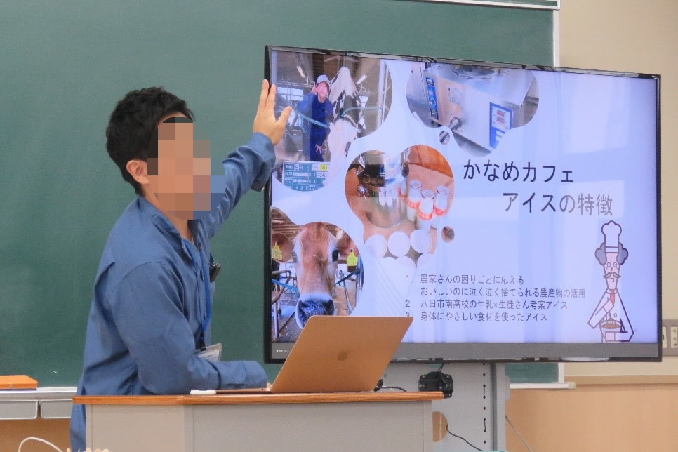 2回目は、八日市高校の前でカフェ経営をされているかなめカフェからお二人にお越しいただき、お話を聞きました。地域とのつながりや食材を大切にしながら経営されていることがわかりました。実際に地域の苺を例として話してくださいました。店頭で売られている苺Aと規格外の苺Bをそれぞれ凍らせて作ったスムージーABを作ってくださり、それを担任のT先生が目隠しをして試飲させていただいたんです。教員の感想は、「どちらか分からないです。どちらも変わりなく、おいしいです!」という感想で、規格外の苺も形をかえて商品にすることで捨てずに使えることを教えていただきました。お話で印象的だったのが、「楽しみながら働くことが大事だよ」、「人の役に立ちたいと思っている」です。