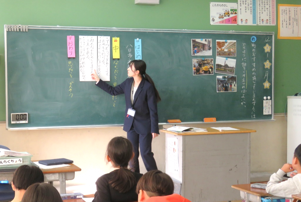 さて、2年生のG先生が国語の授業を公開してくれました。国語科「町で見つけたことを話そう」の単元です。2年生のみんなはこれまで生活科の学習でいろいろなところに町探検に行っています。町探検に行くことで町の自慢したいお気に入りの場所があるようです。それを国語科の「町で見つけたことを話そう」の学習とつなげてくださいました。ですが、簡単ではありません。自慢したいお気に入りの場所を適当に話すのではなく、国語科ですから「順序だてて話すこと」が大切です。さすがG先生です。子どもたちのやる気スイッチをよく知っておられました。子どもたちは、町探検に行ったので八日市のお気に入りの場所を知っていますし、言いたくって仕方がありません。そこで、すかさずG先生は「言いたいことを好きなように話したら何のお話か分からないよね。だから、わかりやすく話すためには、ちょっと工夫してみるといいよ。今日はとてもよい話し方ができる方法を教えるね。それは、「はじめ、中、おわり」のまとまりで話すといいんだよ。先生のお気に入りポイントを話してみるね。」・・・「わたしは、八日市駅のことを紹介します。1つめは・・・です。2つめは・・・です。八日市駅には、・・・・なすてきなところです。」のようにG先生のお気に入りポイントを「はじめ、中、おわり」でまとめて話してくださいました。