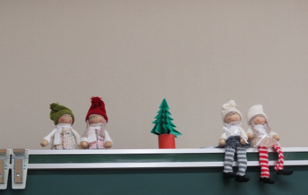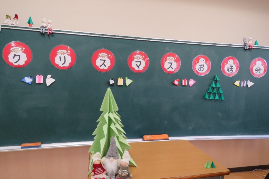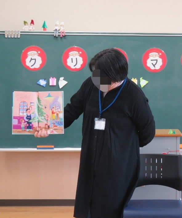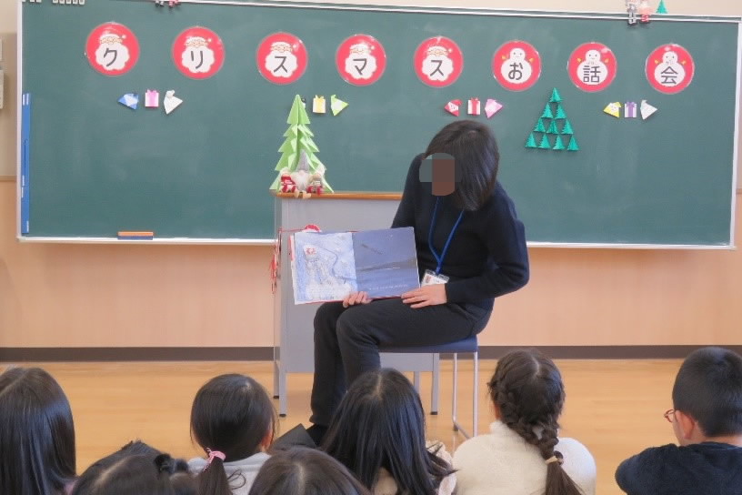 この日は、クリスマスおはなし会がありました。いつも「読書の時間」に各教室に絵本の読み聞かせに来ていただいているボランティアさんたちと学校司書のY先生、そして教頭先生が、普段の読み聞かせだけでなく、何か特別な読み聞かせイベントができないか…と考えてくださり、今回は昨年に引き続き「クリスマスおはなし会」と題して開いてくださいました。会場の飾りつけも凝っていて、サンタクロースやツリー、小人など・・冬らしく、そしてクリスマスムード満載の温かい空間になるように準備してくださいました。