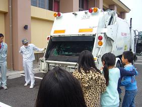 ゴミの収集について学習しました。パッカー車に実際にゴミを投げ入れて、