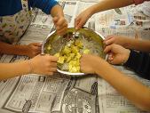 コロコロボールを作っていました。みんなで協力して、サツマイモをつぶ