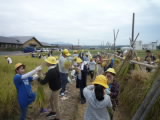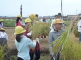 5年生が田んぼの稲刈りを行いました。5月に植えた苗が、大きく育って頭を垂れるようになったので、鎌を使って丁寧に刈り取りました。刈り取った稲は、協力して束にまとめ、稲架にかけて天日干しをします。