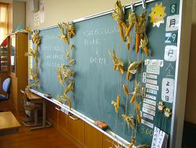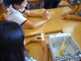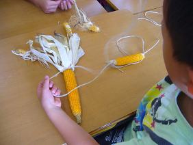 2年生では、学級園で収穫したトウモロコシを干してポップコーン作りをします。