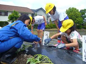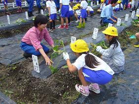 一緒にサツマイモの苗を植えました。秋にはたくさんの大きなサツマイモがとれる