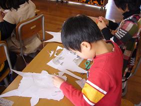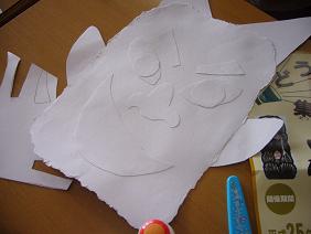 1年生の教室を訪ねてみると、鬼の顔の版画づくりをしていました。