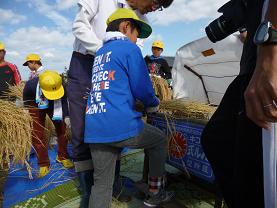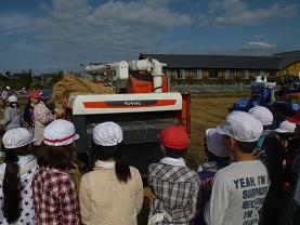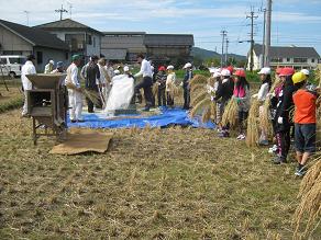 5年生では、先日刈り取った稲を昔ながらの足踏み脱穀機を使って脱穀作業を