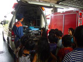 最初、全体で消防署のお話を聞きました。その後、学級ごとに救急車や