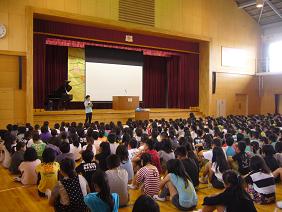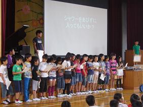 6月の全校集会が体育館で行われ、プール開きがありました。