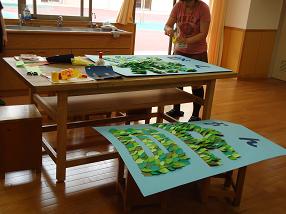 手作りの新しい看板ができあがりました。木の枝に、葉っぱが一枚ずつ付けられて