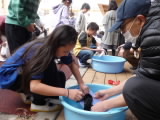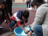3年生がボランティアのお力を借りて昔体験をしました。先に実施した能登川博物館での見学や体験をもとに、学校であらたな体験を行いました。洗濯板を使った体験では、思っていたより汚れが落ちて、先人の知恵に感心するとともに、新しい道具を開発した人々の願いも感じることができました。