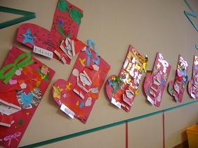 1年生では、色紙を使ってクリスマス飾りを作りました。きれいな飾りがいっぱい