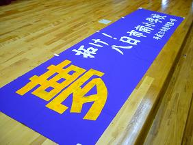 この横断幕は、卒業生の手作りで、市内水泳記録会や陸上記録会で掲げら