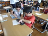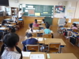 1年生の算数の勉強です。机の横と縦の長さについて、身のまわりにある物を使って測定しました。そして、その結果をもとにみんなで「測定するときの大切なこと」を考えました。みんな最後まで集中して学習していました。