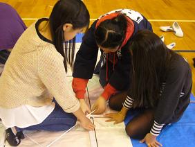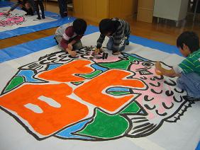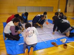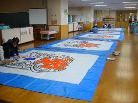 6年生では、大凧保存会の方々に教えていただいて、大凧の骨組みと